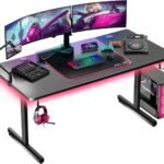 GTPLAYER 55 Inch Gaming Desk with LED Lights, Large Computer Desk with Mouse Pad for Home Office, T-Shaped Carbon Fibre Surface PC Game Workstations with Headphone Hook
